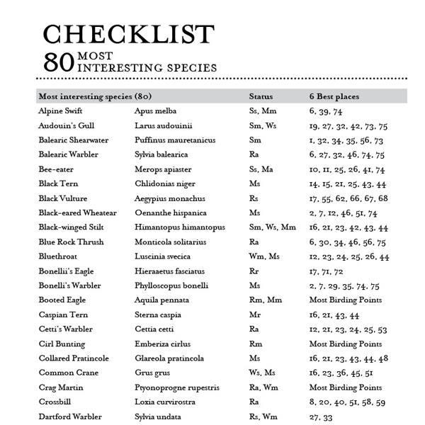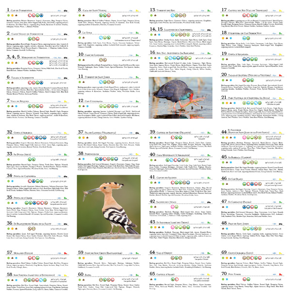 En cadascun dels 75 punts apareix la informació més important per a un birdwatcher: millor època de l'any, tipus d'accés (cotxe, vaixell i grau de dificultat si és a peu), les coordenades GPS i el tipus d'hàbitat i paisatge, així com informació sobre les espècies més interessants, especialment aquelles per les quals val la pena anar fins a aquest punt per observar-les.